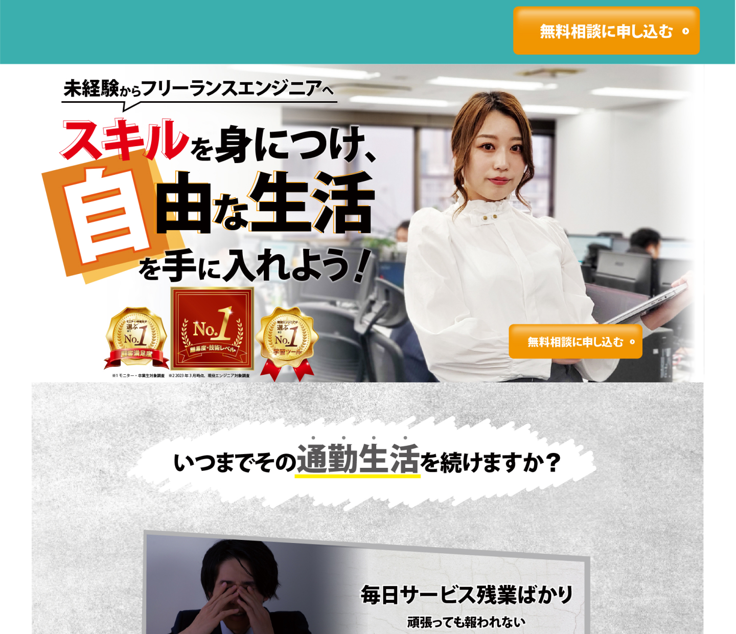 本サービスでは、「勉強をしても実務で通用しなければ意味がない(本物のエンジニアとは言えない)」という軸のもと、エンジニアとは一体何なのか・その需要から興味を引き、競合他社である他スクールでは教えていないカリキュラム内容であることや、経験豊富な現役エンジニアがシステムや教材を制作していることなどが強みとしてあげられることを大きくアピールしました。
